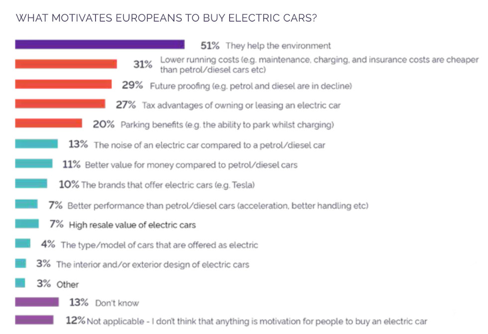 Meanwhile consumers are primarily motivated by EVs’ less harmful effect on the environment compared with regular cars (YouGov, 2020):