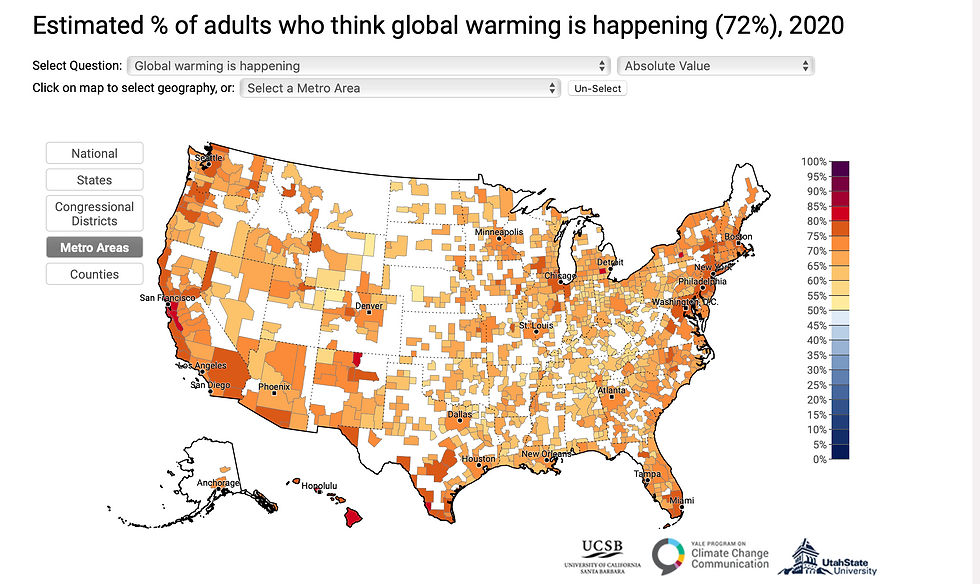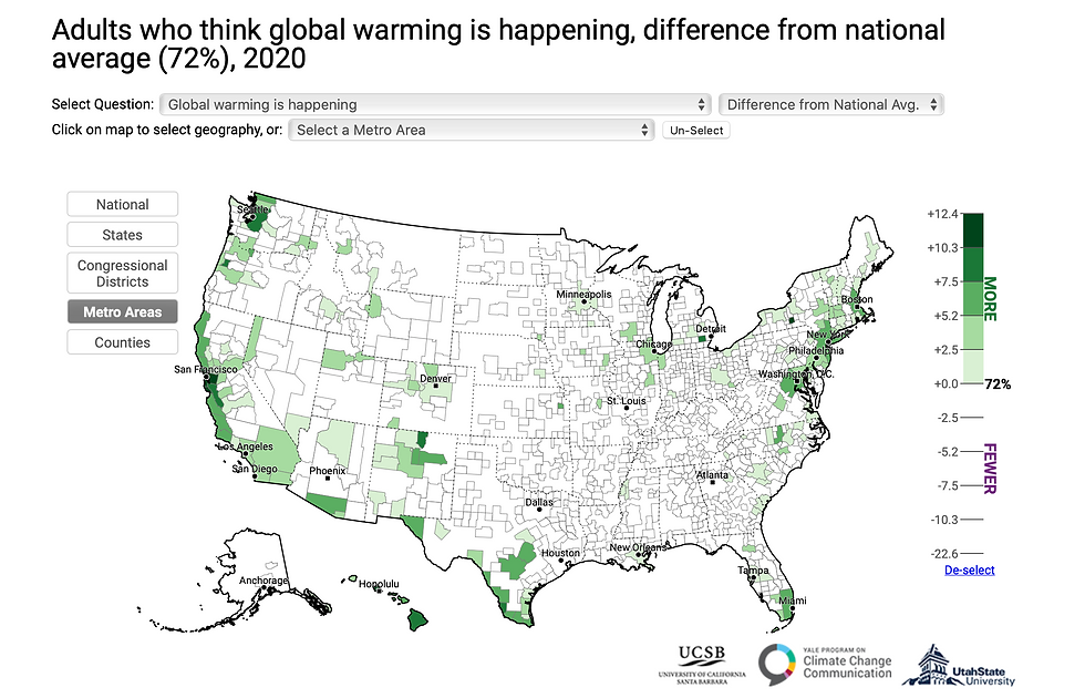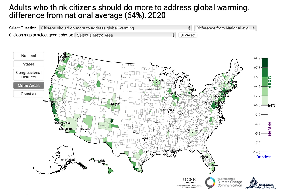 The geo-spatial data yields tremendous consistencies between environmental attitudes and Tesla’s presence. According to Yale’s interactive Climate Opinion Map (2020), all metropolitan areas in the U.S. think global warming is indeed happening. Yet where people hold a firmer opinion that global warming is happening, within these metropolitan regions, tend to overlap with those who think citizens should do more to address global warming. This is measured by the degrees of difference from the U.S. national average. Regions such as Seattle, the Bay Area, the Tri-state Area, and Washinton D.C. are noticeably pronounced in their environmental concerns for global warming.