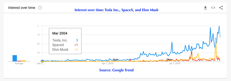 The public interests for Tesla, its founder Elon Musk, and another of Musk’s ventures--SpaceX, are as intertwined with each other as they are sensitive to news events. According to the chart below generated with google search trends, we can perhaps mark a few historic points of interests for Tesla: