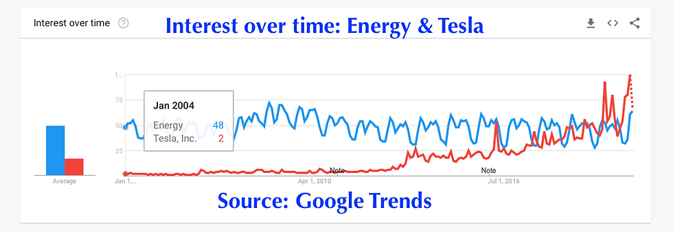 P.S. In my preliminary search, I also tried to put in data relation to the environment (e.g., “Climate Change,” “Wildfire,” etc.,) and politics (e.g. “The Green New Deal,” “Jerry Brown,” “Gavin Newsom”-California’s previous and incumbent governors with ambitious climate goals). The results were either incomparable or did not demonstrate any correlation. (Tesla’s search relevance seemed to overshadow all others, as "Climate Change" would make "Tesla" appear insignificant.)